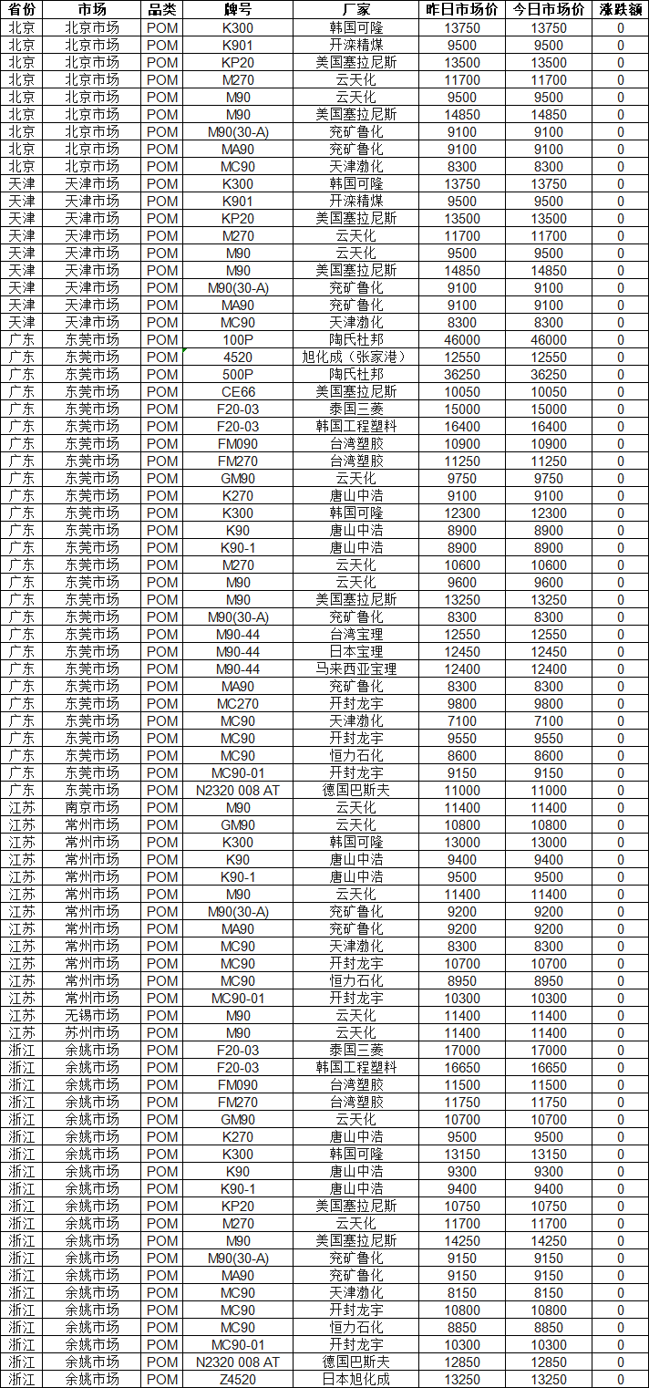 Today’s market-wide POM price range is RMB 7,100–46,000 per ton, with the market median at RMB 10,700 per ton.