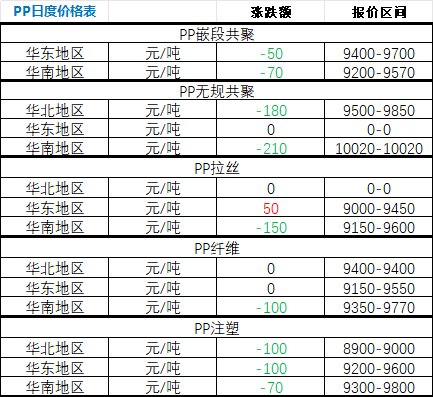 According to the Special Plastics View, on March 26, the PP market in major regions across the country saw more declines than increases. Specifically: The price of PP block copolymer in the East China market fell by 50 yuan; the South China market fell by 70 yuan. The price of PP random copolymer in the North China market fell by 180 yuan; the East China market remained unchanged from the previous day; the South China market fell by 210 yuan. The price of PP filament in the North China market remained unchanged from the previous day; the East China market rose by 50 yuan; the South China market fell by 150 yuan. The price of PP fiber in the North China market remained unchanged from the previous day; the East China market remained unchanged from the previous day; the South China market fell by 100 yuan. The price of PP injection molding in the North China market fell by 100 yuan; the East China market fell by 100 yuan; the South China market fell by 70 yuan.