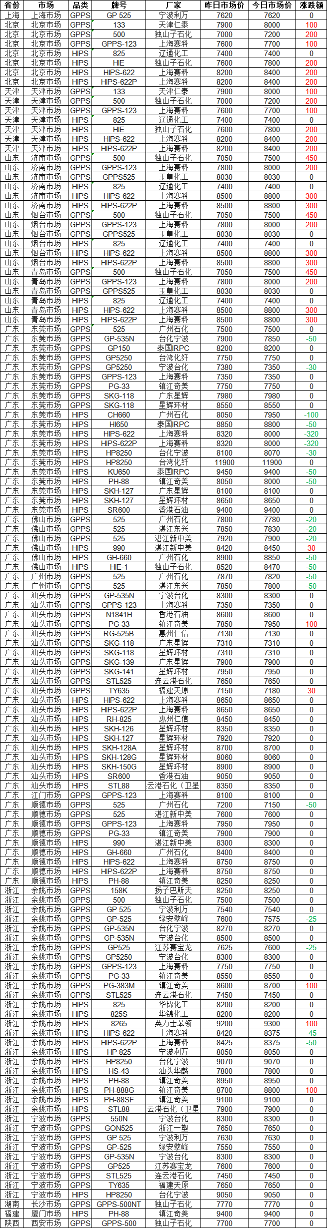According to ZS Vision statistics, as of 16:00 on January 20th, PS market prices across the country showed mixed trends, with 23% of quotes rising and 16% falling. The highest increase was 450 yuan, and the largest decrease was 320 yuan. Currently, Dushanzi Petrochemical 500 is quoted at 7500 yuan in the Jinan market. Today, the national PS market price range is 7130-11900 yuan, with a market median of 8000 yuan.