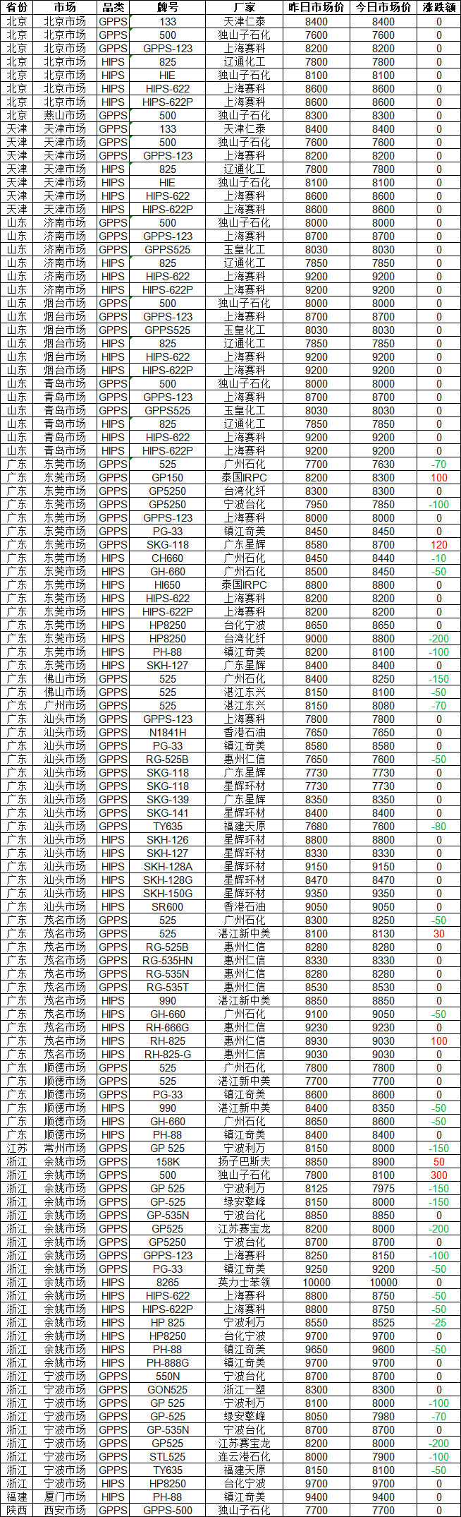 Zhuansushi Vision statistics show that as of 4:00 PM on February 2nd, PS markets across the country are stable with a slight downward trend! 68% of market quotes remained stable, with the largest drop being 200 yuan. Currently, the price of Taiwan Chemical Fiber HP8250 in Dongguan market is 8800 yuan. Today, the PS price range in the whole market is 7600-10000 yuan, with a market median of 8340 yuan.