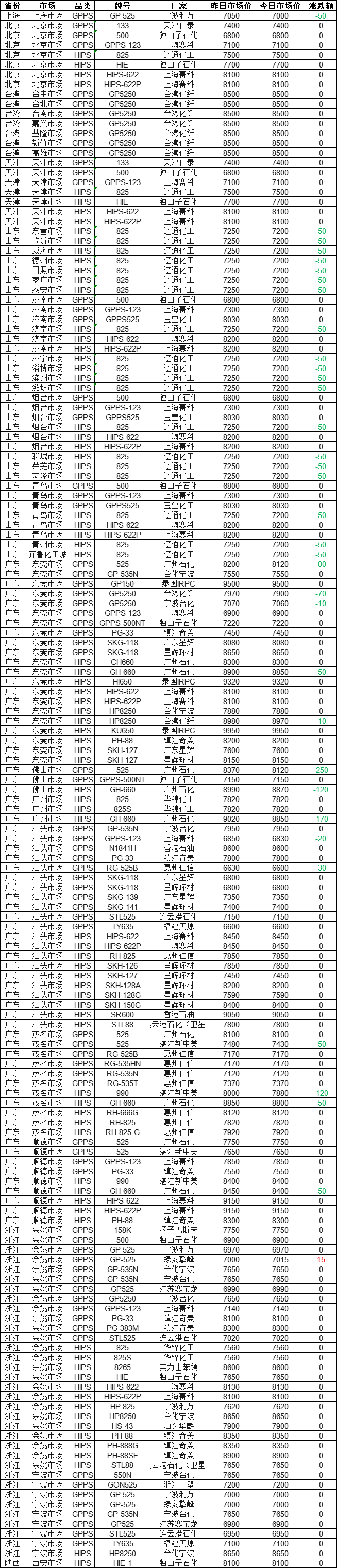As of 16:00 on November 19, according to the statistics from Zhuan Su Shi Jie, the PS market across various regions in the country has remained stable with slight declines. 78% of the market prices are stable, with a maximum drop of 250 yuan. Currently, the Guangzhou Petrochemical 525 in the Foshan market is quoted at 8,120 yuan. Today's PS market price range is 6,600-9,950 yuan, with a median market price of 7,650 yuan.