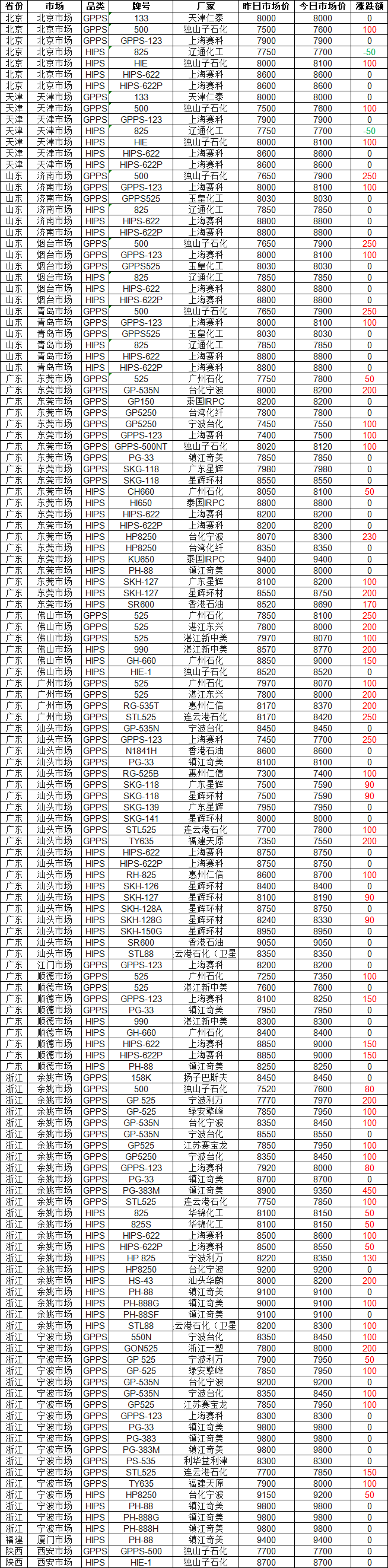 According to ZS Plastic Vision statistics, as of 16:00 on January 23rd, the national PS market remained stable with some increases! 49% of the market quotes were stable, with the highest increase of 450 RMB. Currently, the price of Zhenjiang Chimei PG-383M in the Yuyao market is 9350 RMB. Today, the overall market PS quotation range is 7350-9800 RMB, with a market median of 8200 RMB.