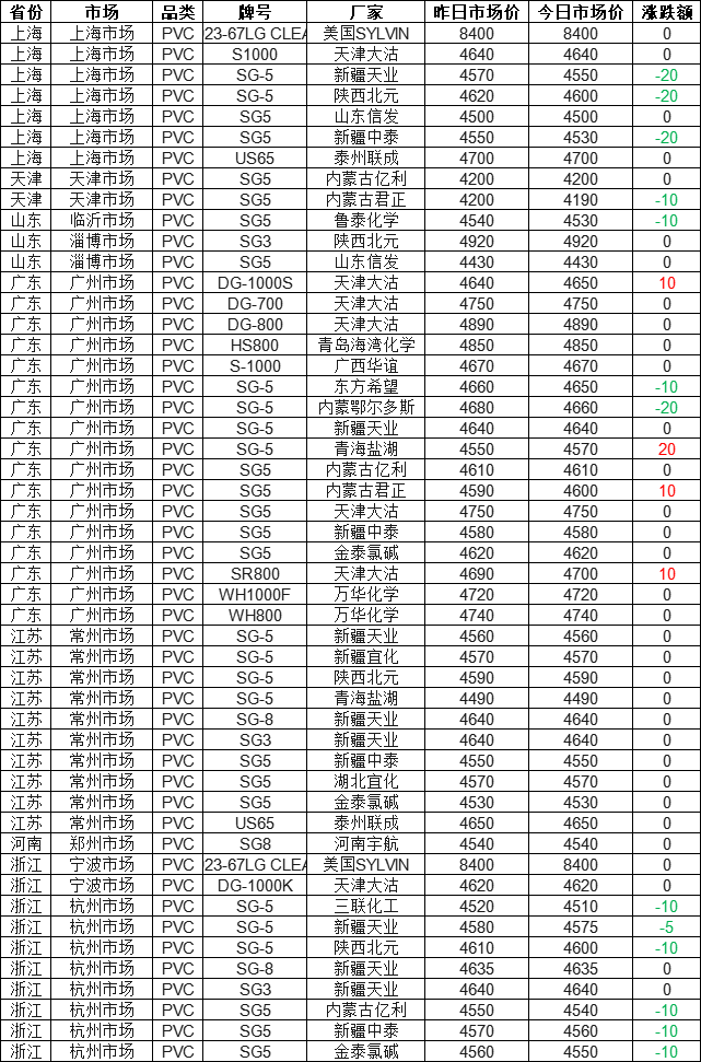 As of 16:00 on November 13, the specialized plastics market statistics show that the PVC market across the country is generally stable with slight declines. Prices remained stable for 66% of the market, with a maximum drop of 20 yuan. Currently, in the Shanghai market, the Xinjiang Tianye SG-5 is quoted at 4,550 yuan. Today's PVC market price range is 4,190-8,400 yuan, with a median price of 4,605 yuan.