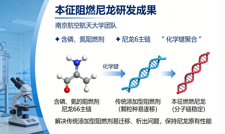 Reactive Intrinsic Flame Retardancy: A research team from Nanjing University of Aeronautics and Astronautics developed “intrinsically flame-retardant nylon” by chemically incorporating phosphorus- and nitrogen-containing flame retardants directly into the backbone of nylon 66 via covalent bonding. This approach fundamentally resolves the issues of migration and blooming commonly associated with conventional additive flame retardants, while maximally preserving nylon’s original excellent properties.