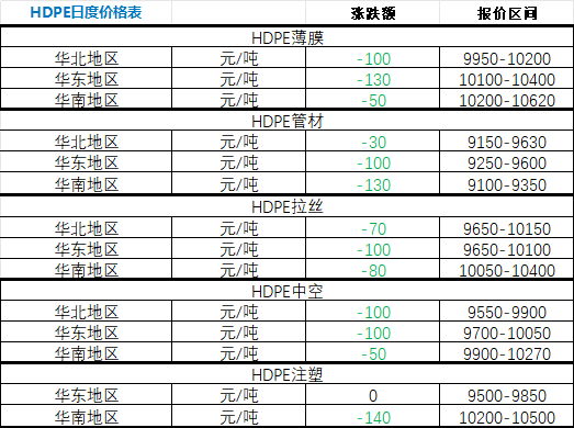 According to the statistics from Zhuan Su Shi Jie, on April 16, the HDPE market in major regions across the country showed more declines than increases, specifically: HDPE film in North China fell by 100 yuan; in East China, it fell by 130 yuan; in South China, it fell by 50 yuan. HDPE pipe in North China fell by 30 yuan; in East China, it fell by 100 yuan; in South China, it fell by 130 yuan. HDPE filament in North China fell by 70 yuan; in East China, it fell by 100 yuan; in South China, it fell by 80 yuan. HDPE hollow in North China fell by 100 yuan; in East China, it fell by 100 yuan; in South China, it fell by 50 yuan. HDPE injection molding in East China remained unchanged from the previous day; in South China, it fell by 140 yuan.