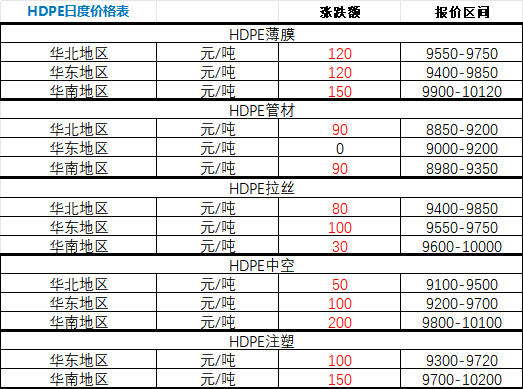 According to ZhuanSu Vision statistics, on March 31, the national HDPE markets across major regions mostly rose, with limited declines. Specifically: - HDPE film prices rose by RMB 120/ton in North China, RMB 120/ton in East China, and RMB 150/ton in South China. - HDPE pipe prices increased by RMB 90/ton in North China, remained unchanged in East China, and rose by RMB 90/ton in South China. - HDPE raffia prices rose by RMB 80/ton in North China, RMB 100/ton in East China, and RMB 30/ton in South China. - HDPE blow molding prices increased by RMB 50/ton in North China, RMB 100/ton in East China, and RMB 200/ton in South China. - HDPE injection molding prices rose by RMB 100/ton in East China and RMB 150/ton in South China.