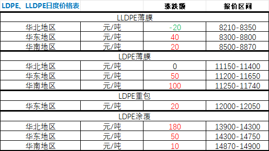 According to ZhuanSu Vision statistics, on April 28, LLDPE and LDPE prices across major regions nationwide mostly rose, with few declines. Specifically: LLDPE film prices decreased by RMB 20/ton in North China, rose by RMB 40/ton in East China, and increased by RMB 20/ton in South China. LDPE film prices remained unchanged in North China, rose by RMB 50/ton in East China, and increased by RMB 100/ton in South China. LDPE heavy-duty packaging prices rose by RMB 20/ton in East China. LDPE coating-grade prices surged by RMB 180/ton in North China, rose by RMB 50/ton in East China, and increased by RMB 10/ton in South China.