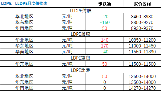 According to Zhuan Su Shijie's statistics, on March 26, in the major regions across the country, LLDPE saw more decreases than increases, while LDPE saw more increases than decreases. Specifically: LLDPE film in the North China market decreased by 20 yuan; in the East China market, it decreased by 150 yuan; in the South China market, it increased by 50 yuan. LDPE film in the North China market increased by 140 yuan; in the East China market, it increased by 170 yuan; in the South China market, it decreased by 40 yuan. LDPE heavy packaging in the East China market increased by 50 yuan; LDPE coating in the North China market increased by 50 yuan; in the East China market, it remained the same as yesterday; in the South China market, it remained the same as yesterday.