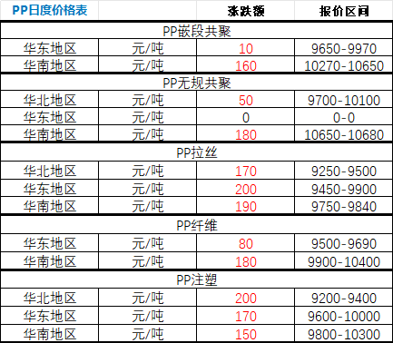 According to Zhuan Su Shi Jie statistics, on April 7, prices of polypropylene (PP) in major regional markets across China rose more than they fell. Specifically: - PP block copolymer: prices rose by RMB 10/ton in the East China market and by RMB 160/ton in the South China market. - PP random copolymer: prices rose by RMB 50/ton in the North China market, remained unchanged in the East China market, and rose by RMB 180/ton in the South China market. - PP homopolymer (for fiber spinning): prices rose by RMB 170/ton in the North China market, by RMB 200/ton in the East China market, and by RMB 190/ton in the South China market. - PP fiber-grade: prices rose by RMB 80/ton in the East China market and by RMB 180/ton in the South China market. - PP injection-molding grade: prices rose by RMB 200/ton in the North China market, by RMB 170/ton in the East China market, and by RMB 150/ton in the South China market.