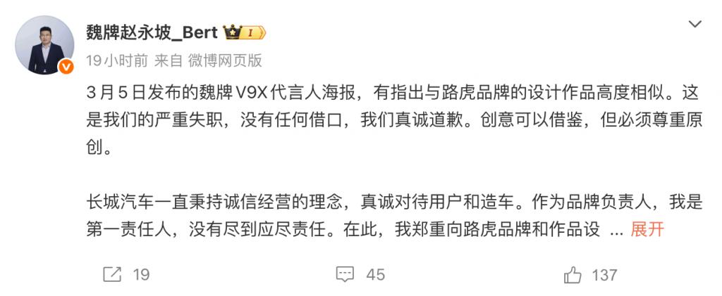 On March 6, Wei Jianjun released a video apology, stating that after verification, the poster was indeed plagiarized, and there could be no justification. He apologized to Land Rover, the designer of the original poster, and netizens. Wei Jianjun said that Great Wall Motor is willing to bear all the legal and economic responsibilities arising from this. He stated that the main responsibility for this issue was due to lax review, and "I will also deeply reflect on management and processes to resolutely prevent plagiarism." Currently, Great Wall Motor and the WEY brand have removed the related posters.