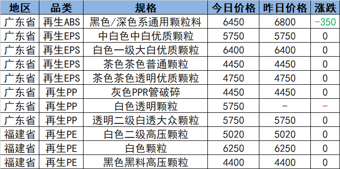 Summary: On April 21, the morning prices of the recycled plastic market in South China! Individual declines in the South China recycled market, recycled ABS in Guangdong fell 350 to 6450, recycled PP in Guangdong is quoted at 4450-5750; recycled PE in Fujian is quoted at 4400-3250. Market downstream customers have a strong wait-and-see attitude, and the enthusiasm for inquiries is not high. Recycled enterprises maintain stable quotations, and there are few transactions in the market.