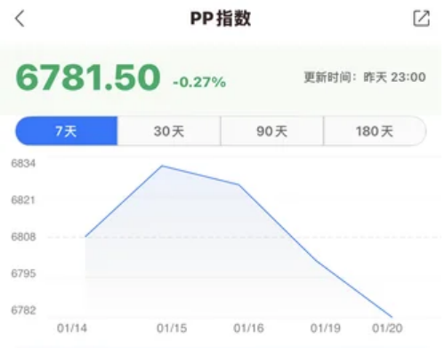 South China PP price index at 6781.5 points, down 41.52 points week-on-week, a decrease of 0.61%. Among them, raffia down 30, fiber down 20, copolymer flat, thin wall flat, homopolymer flat.