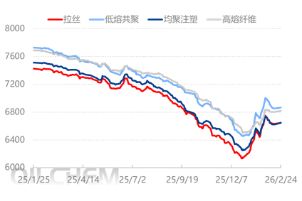 After the Spring Festival, the market was mainly influenced by the rise in crude oil prices during the holiday, and there are still expectations for policies after the Two Sessions. Coupled with the plan for a meeting between high-level officials from China and the United States at the end of March, which may boost market sentiment, the macroeconomic support is strong, leading to a slight increase in prices. However, the resumption of work downstream is delayed, and market inquiries are limited. There are a few transactions at low prices, and the market participants are cautious. As of February 24, the national average price of drawing silk was 6,644 yuan/ton, an increase of 10 yuan/ton, or 0.15%, compared to before the holiday.