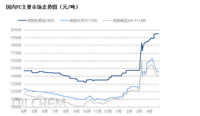 In April, the domestic PC market as a whole showed a trend of strong price increases in the first half, high-level fluctuations in the middle, and pressure-induced declines in the latter part. The leading logic of the market situation shifted from supply-side maintenance and reduction to the decline in raw material costs and the weakening of downstream demand. The overall market sentiment shifted from bullish to watchful, and the trading pace slowed significantly with the market fluctuations. At the beginning of the month, under the expectation of supply tightening, producers collectively raised prices actively, and the PC market price rose steadily, with a strong bullish atmosphere. In the middle of the month, the price trends for PC products from different processes diverged, with the prices of products using the phosgene method remaining firm at high levels, while those of non-phosgene method products fell significantly. The market was mainly in a weak adjustment phase, under the dual pressure of weakening raw material prices and sluggish demand. In the latter half of the month, influenced by the continued decline in the price of the raw material BPA and insufficient follow-up from downstream rigid demand, the market's speculative buying sentiment subsided. Merchants mostly adopted a strategy of price concessions to move inventory, and the spot prices gradually came under pressure to decline. At the end of the month, driven by the auction price surge of Zhejiang Petrochemical and the release of pre-May Day inventory replenishment demand from downstream, the market showed a tail-end rise. As of the close on April 28, the main negotiation range for domestic injection molding grade PC in the East China market was 14,250-16,500 yuan/ton, a decrease of 50-500 yuan/ton from the end of the previous month, representing a decline of 0.30%-3.39%. Compared to the same period last year, prices increased by 3,250-4,500 yuan/ton.