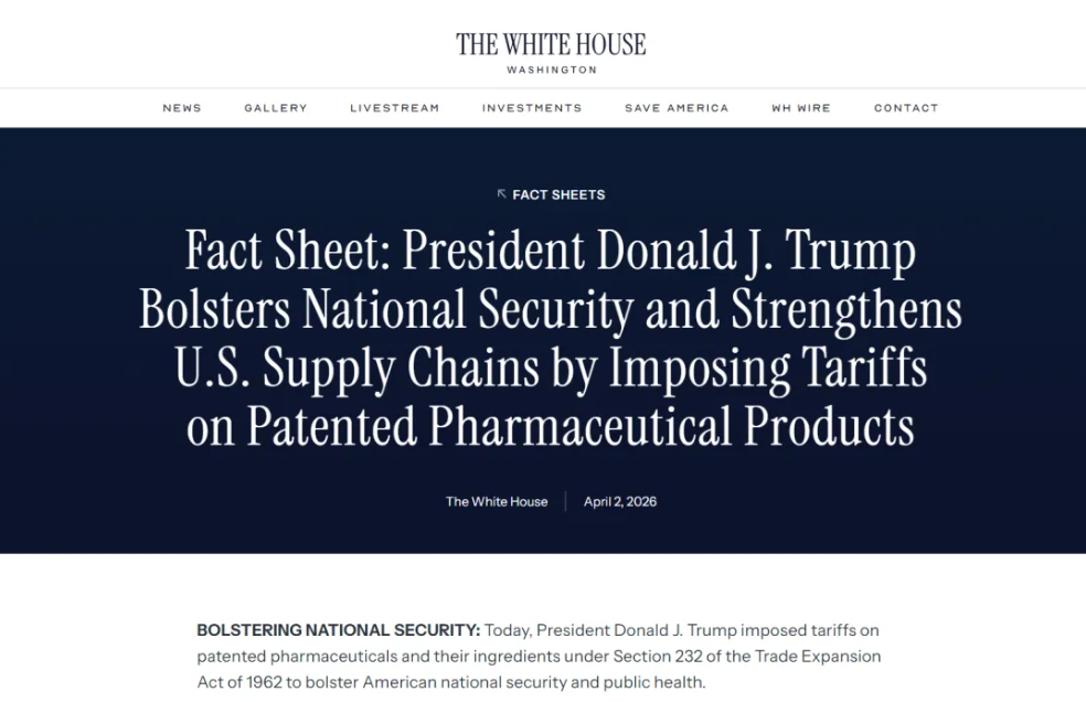 On April 2nd local time, a message from Washington shocked the global pharmaceutical industry: the U.S. government will impose a 100% tariff on some imported medicines. The White House announced on the same day that President Trump had signed a document, invoking Section 232 of the 1962 Trade Expansion Act, to impose this so-called "nuclear weapon" level of tariff measures on imported patented drugs and pharmaceutical ingredients.