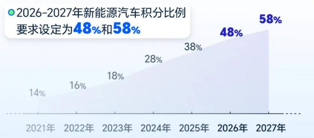 Simultaneously, on a policy level, the "Passenger Car Fuel Consumption Evaluation Methods and Indicators" to be implemented in 2026 is dubbed the "strictest fuel consumption standard." Through differentiated assessment and full-lifecycle supervision, it compels car manufacturers to accelerate their transition to new energy vehicles. The new energy vehicle credit ratio for car manufacturers needs to reach 48% in 2026 and further increase to 58% in 2027, further strengthening the development orientation towards new energy.