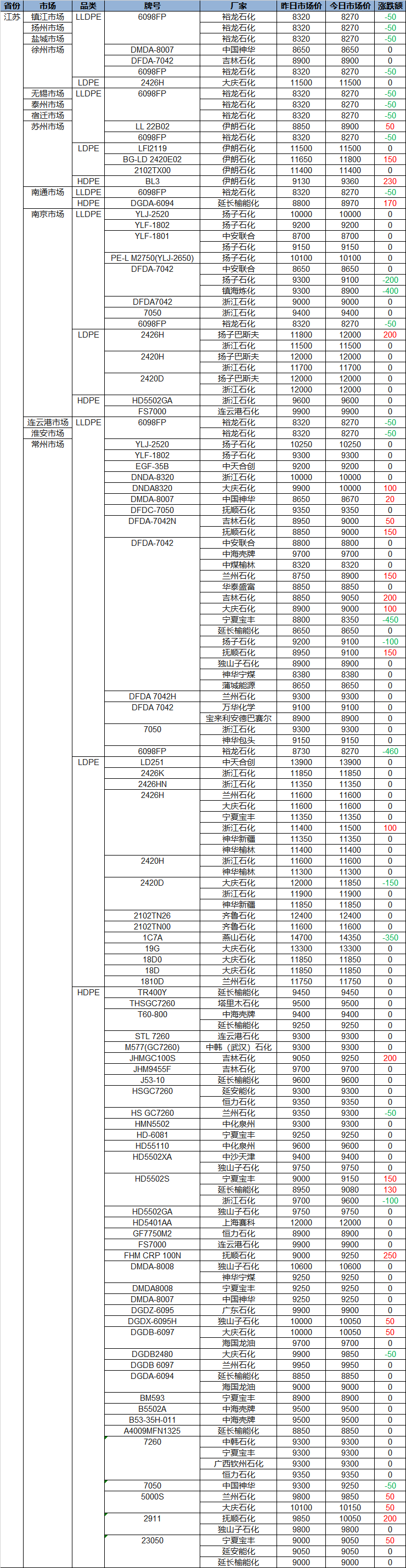 Today’s PP and PE Jiangsu Plastic Prices: Weak Volatility—PP Up by CNY 250, PE Down by CNY 460