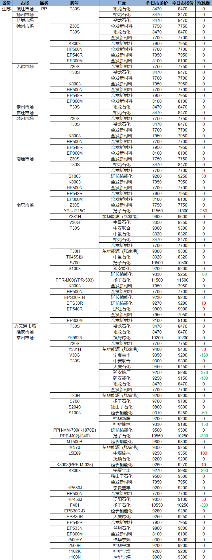 Summary: On April 3, the morning prices of the Jiangsu polyolefin market! PP is partially fluctuating, with some prices rising and falling by 10-100, the highest increase being 250, and the highest decrease being 370; PE prices are mixed, with some prices rising and falling by 50-200, the highest increase being 250, and the highest decrease being 460.