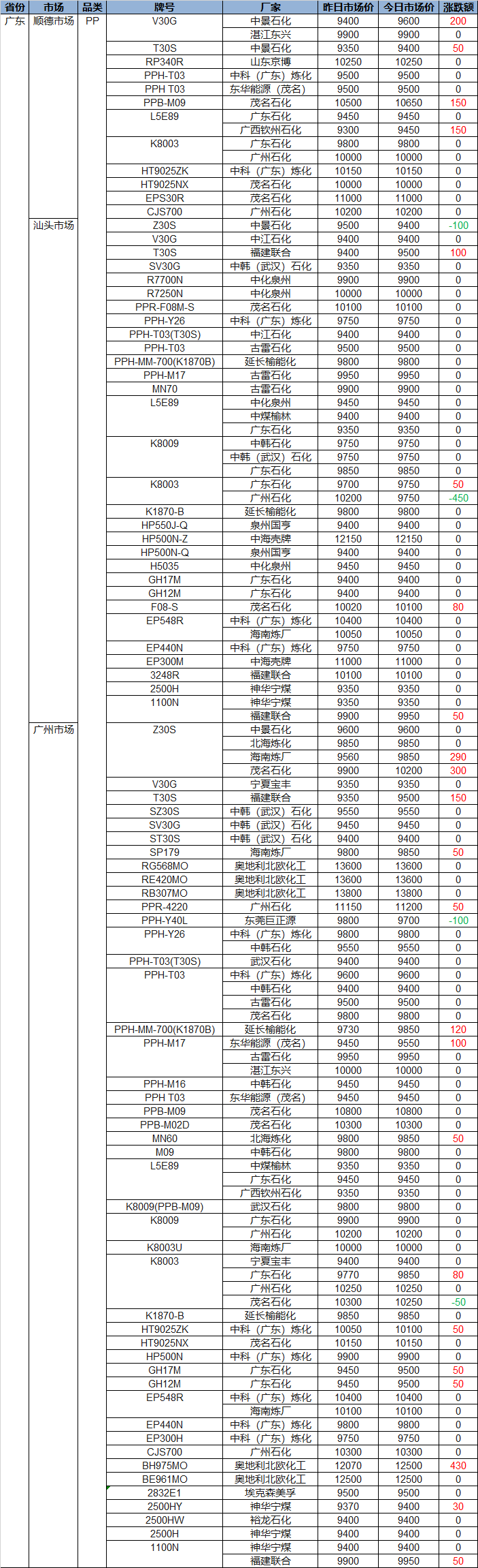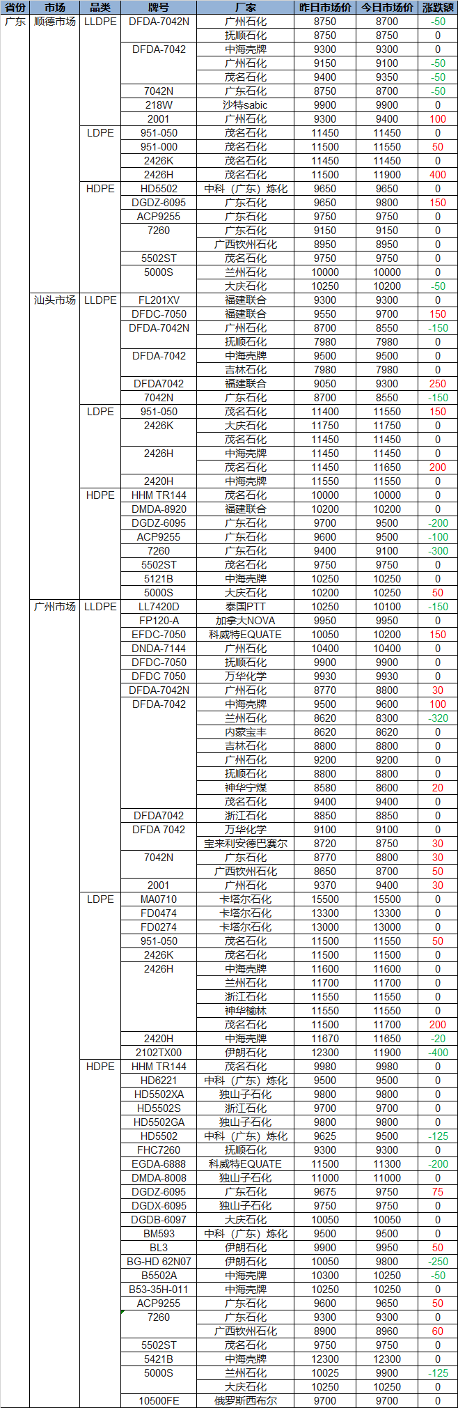 Summary: Guangdong Polyolefin Market Early Price on April 21! PP prices rose more than fell, with some up or down by 50-200, the highest up 430, the highest down 450; PE prices fluctuated, with some up or down by 50-300, the highest up or down 400.