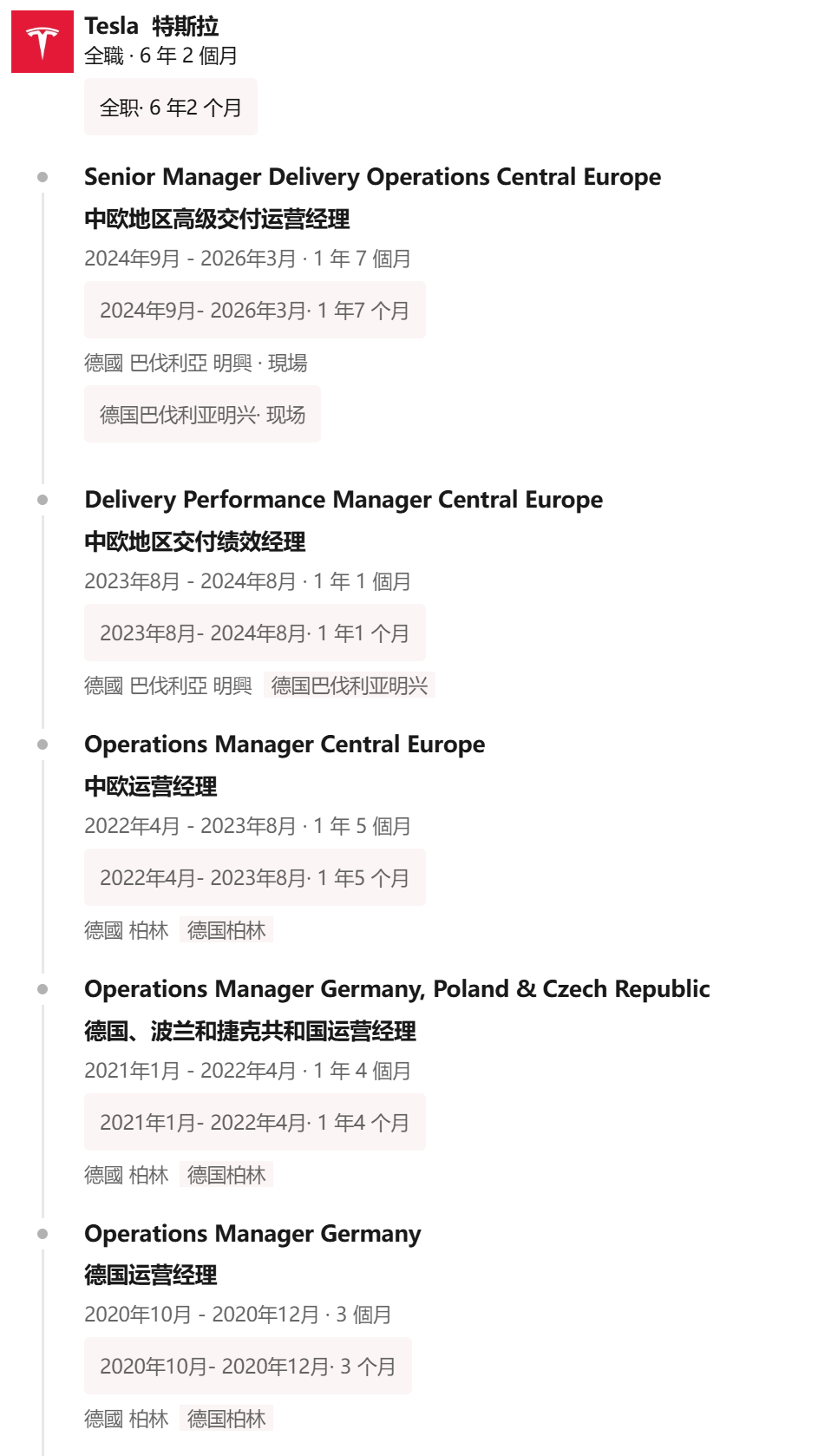 IT Home checked Dieter Lorenz's LinkedIn profile and found thatHe has served in multiple positions at Tesla, including Central and Eastern Europe Operations Manager, Germany Operations Manager, and Operations Director.。