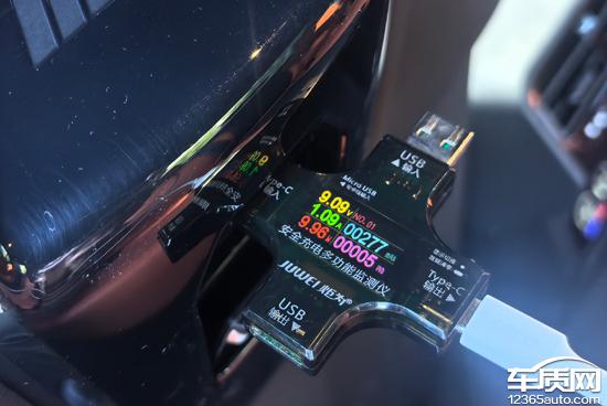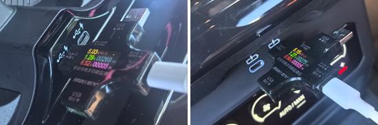 At the same time, we tested the voltage, current, and power of the USB ports. The test results for the front-row USB Type-C were approximately 5.03V, 1.29A, and 6.52W; the second-row USB Type-C at the air conditioning vents had test results of 5.15V, 1.27A, and 6.60W; the USB Type-C at the back of the front seats had test results of 9.09V, 1.09A, and 9.96W.