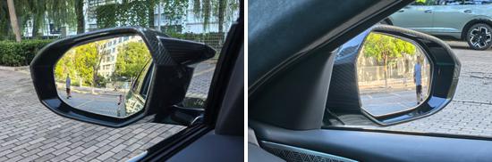 The vehicle evaluation showed that both the left and right exterior rearview mirrors use aspheric lenses. The actual field of view for the left exterior rearview mirror is 23.9°, while the right exterior rearview mirror has a field of view of 22°. The field of view for the exterior rearview mirrors on both sides is in the lower-middle and middle levels, respectively, compared to others in the same class.