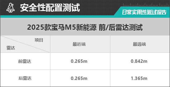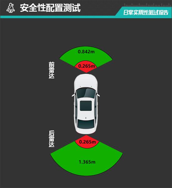 During testing, the reverse radar could detect objects at a distance of 1.365m, demonstrating excellent radar power. Based on the measured data, the nearest sensing distance of the test vehicle's reverse radar is 0.265m, reaching the average level of vehicles in the same class.