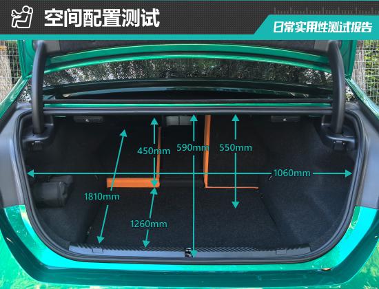 For the basic measurements of the trunk, we conducted an actual test. The opening length is 590mm, the opening width is 1060mm, the trunk depth is 1260-1810mm, and the vertical height is 450-550mm.