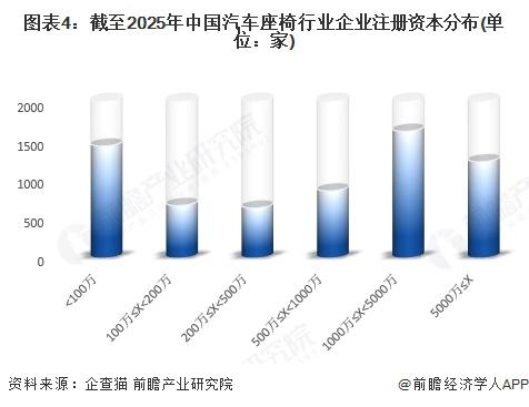 According to data from Qichamao, as of August 2025, the registered capital of Chinese automotive seat companies is mainly distributed between 10 and 50 million yuan, with 1,613 companies accounting for 25%. Companies with more than 50 million yuan registered capital number 5,188, making up 19.1%. Overall, approximately 57% of Chinese automotive seat companies have a registered capital of more than 5 million yuan, and 44% have a registered capital of more than 10 million yuan. The registered scale of enterprises in the automotive seat industry is relatively large.