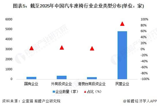 According to data from Qichamao, as of August 2025, there are a total of 4,800 private enterprises in China's automotive seat industry, accounting for 85.8% of the total. The number of foreign-invested enterprises, investment from Hong Kong, Macau, and Taiwan, and state-owned enterprises is relatively similar, at 343, 213, and 236 respectively, accounting for 6.1%, 3.8%, and 4.2%. Overall, private enterprises are the most dynamic force in the development of China's automotive seat industry.