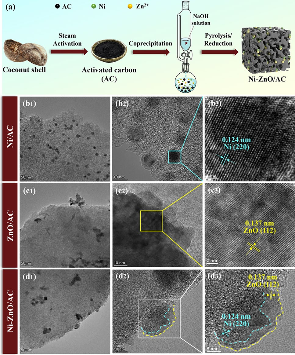 Figure 1 The synthesis process and microstructure characterization of Ni-ZnO/AC. a Synthesis steps of Ni-ZnO/AC. b TEM image of Ni/AC, c TEM image of ZnO/AC, and d TEM image of Ni-ZnO/AC.