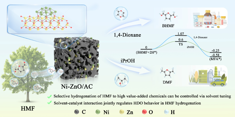 This study constructed a Ni-ZnO/AC heterogeneous catalyst coupled with different solvent catalytic conversion systems, achieving precise conversion of the biomass platform molecule HMF to high value-added products.
