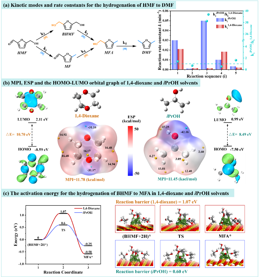 Figure 3 Kinetics, molecular properties, and energy barrier analysis of HMF hydrogenation in 1,4-dioxane/isopropanol solvent.