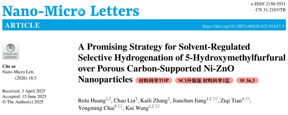 The related research results are presented in "A Promising Strategy for Solvent-Regulated Selective Hydrogenation of 5-Hydroxymethylfurfural over Porous Carbon-Supported Ni-ZnO Nanoparticles." In "Nano-Micro Letters" (IF 36.3) 。