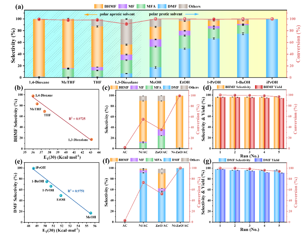 Further analysis revealed that the selectivity of BHMF and DMF is linearly positively correlated with the solvent polarity ET(30) value, indicating that solvent polarity can significantly enhance the solubility of the substrate and the degree of reaction completion, thereby affecting the reaction pathway and product distribution.