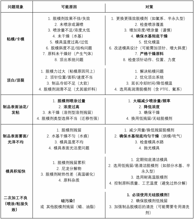 Complex structure, deep cavity, slender core pin, small draft angleSemi-permanent mold release agentorHigh-performance, highly lubricating release agent (such as fluorosilicone-based)is a better choice.