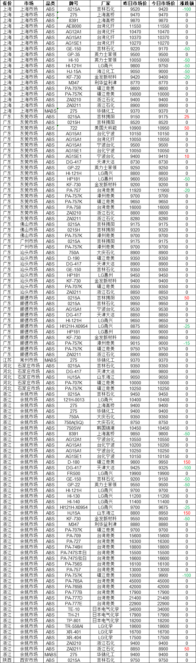 ABS Price Summary: ABS Market Remains Stable With Some Declines on September 15, Maximum Drop of 100 Yuan