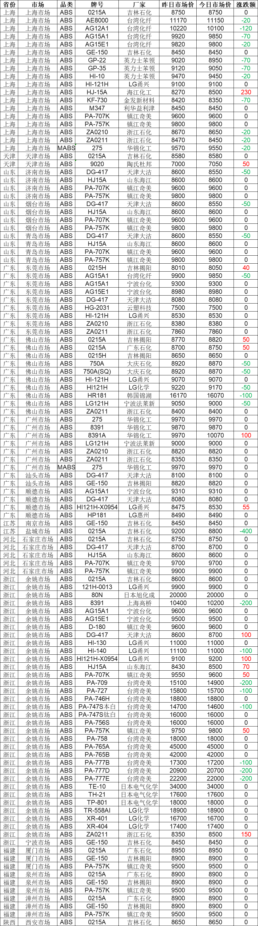 According to statistics from Zhuangsu Shijie, as of 4:00 PM on October 27, the ABS market across the country is stable with a slight decline! 63% of the market quotes remained stable, with the largest drop being 400 yuan. Currently, the price of Jilin Petrochemical 0215A in the Yancheng market is 8800 yuan. Today's ABS price range in the market is 7050-45000 yuan, with a median price of 9100 yuan.