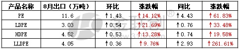 According to customs data statistics, in August 2025, China's PE export volume reached 116,000 tons, showing a growth trend both month-on-month and year-on-year. From January to August, China's total PE export volume was 729,800 tons, an increase of 25.94% compared to the same period last year.