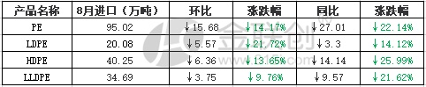According to customs data, in August 2025, China's PE import volume was 950,200 tons, showing a decrease both year-on-year and month-on-month. From January to August, China's total PE import volume was 8,981,500 tons, a decrease of 0.84% compared to the same period last year.