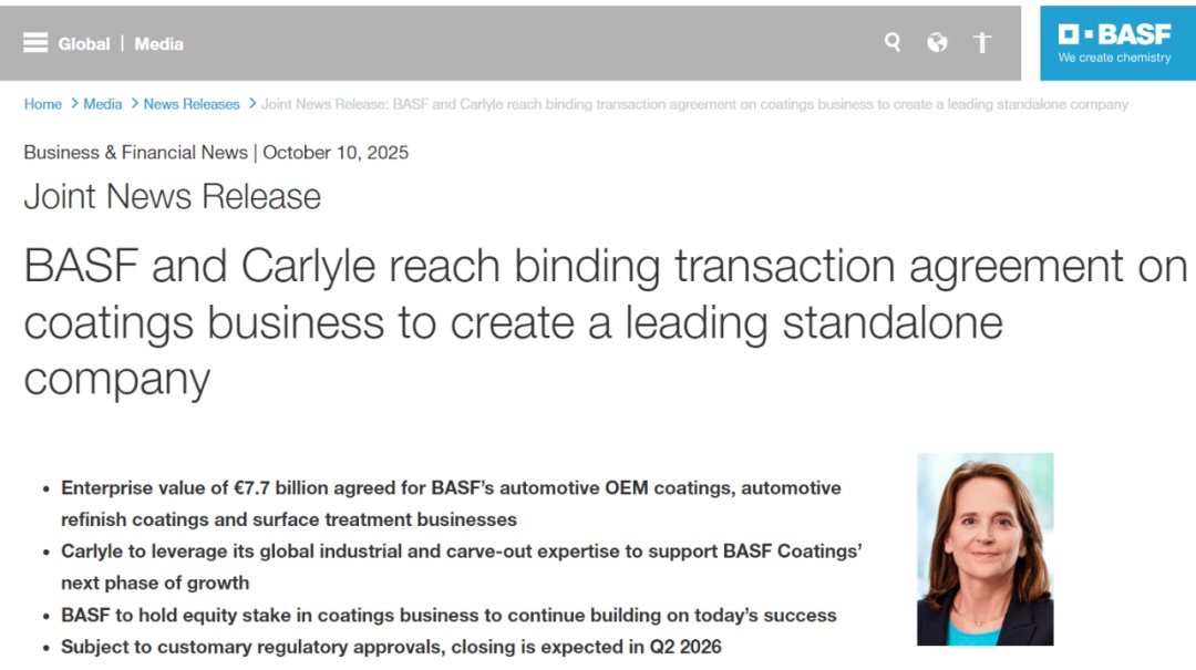 This transaction marks the conclusion of one of the largest corporate deals in Germany this year and adds a significant chapter to BASF's recent large-scale business restructuring. What details of this transaction are worth noting? What are BASF's strategic considerations behind the sale of its coatings business? What background do the acquirers have? What impact will this move have on the global chemical industry? Today, we will analyze the key points behind this with insights from multiple sources.