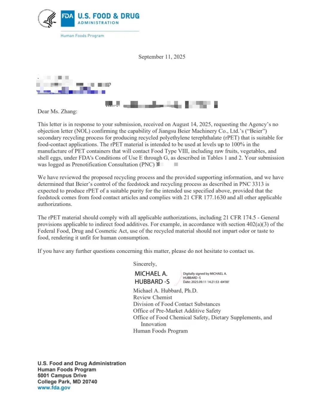 September 11, 2025Jiangsu Bell Machinery Co., Ltd.Successfully obtained issued by the U.S. Food and Drug Administration (FDA)No Objection Letter for Recycled Plastics in the United States(NOL). This certification is assisted by Hangzhou Ruio Technology Co., Ltd.