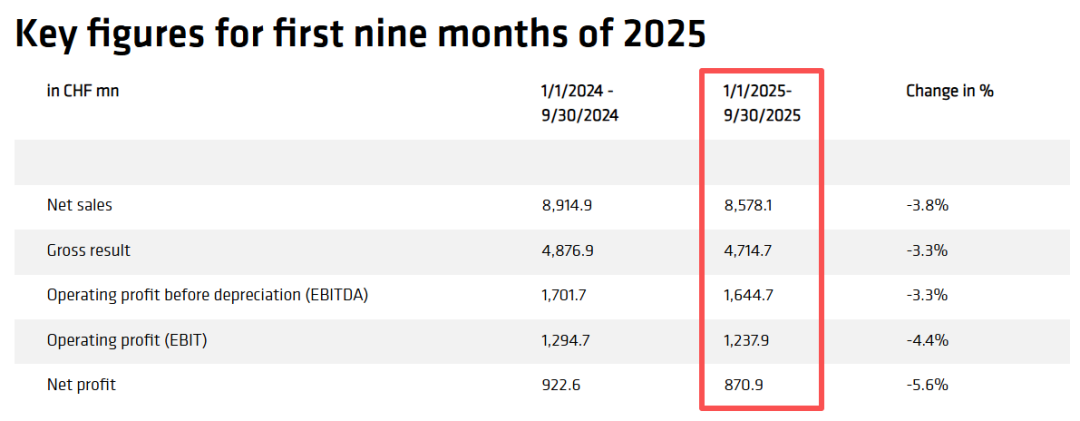 Overall, due to the impact of a weak US dollar, the foreign exchange effect amounted to -4.9%, leading to a decline in sales calculated in Swiss francs to CHF 8.58 billion (previous year: CHF 8.91 billion). The material margin rose to 55.0% (previous year: 54.7%). The EBITDA margin expanded to 19.2% (previous year: 19.1%), thanks to a slight decrease in input costs and strong synergies from the successful integration of MBCC, although a decline in sales in the Chinese market led to a drop in EBITDA by approximately 50 basis points. Due to significant exchange rate fluctuations, the earnings before interest, taxes, depreciation, and amortization (EBITDA) for the first nine months was CHF 1.64 billion, lower than CHF 1.7 billion for the same period last year.