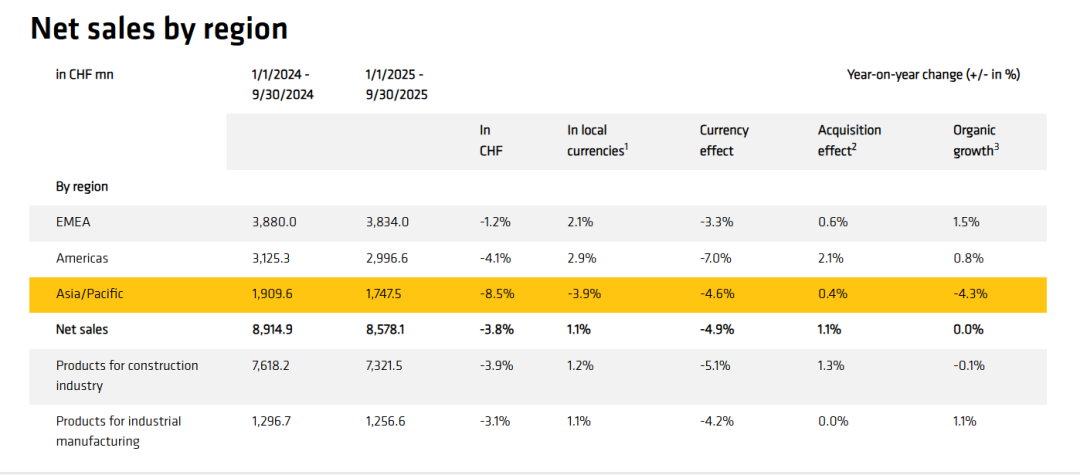 Despite a double-digit decline in the construction business in China, sales for the first nine months still grew by 1.1% in local currency terms; furthermore, excluding the construction business in China, the group's growth rate in local currency terms was approximately 3%.