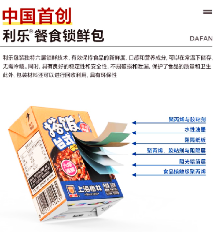 "Dafan" uses Tetra Recart food preservation packages, which also have excellent environmental performance. Tetra Recart packages can keep food fresh for 18 months at room temperature and restore the taste of freshly cooked meals in just 3 minutes. In terms of carbon emissions, the renewable materials used in Tetra Recart packaging account for 71%, and compared to glass bottles and canned packaging, its carbon emissions can be reduced by up to 85%.