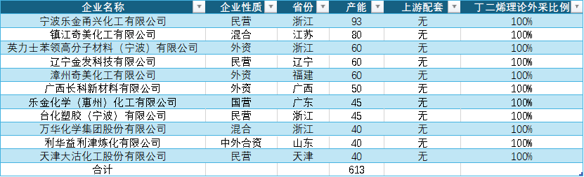 It is noteworthy that only 25.53% of ABS facilities are equipped with supporting butadiene raw materials, which means that nearly 75% of ABS facilities need to purchase butadiene externally. Raw material cost becomes a key variable affecting the profitability of enterprises.