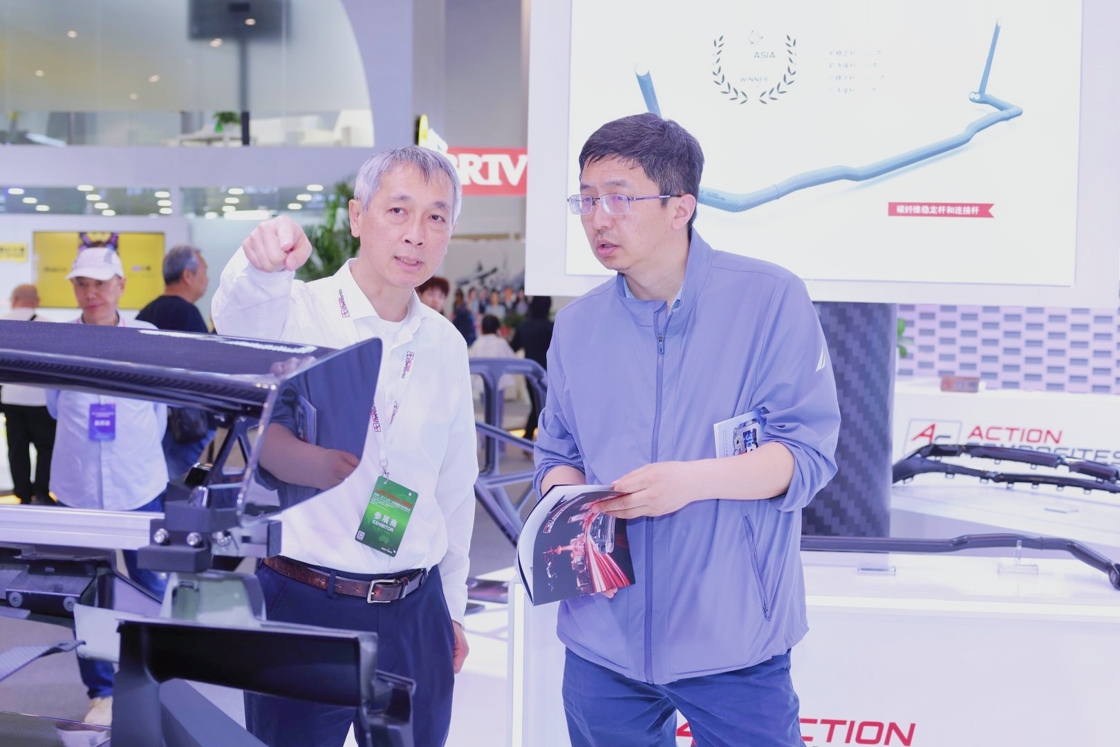 Chairman Liao Guoxing of Aikexun Group explains to visitors at the Beijing Auto Show about the applications of carbon fiber automotive parts, visible and invisible.