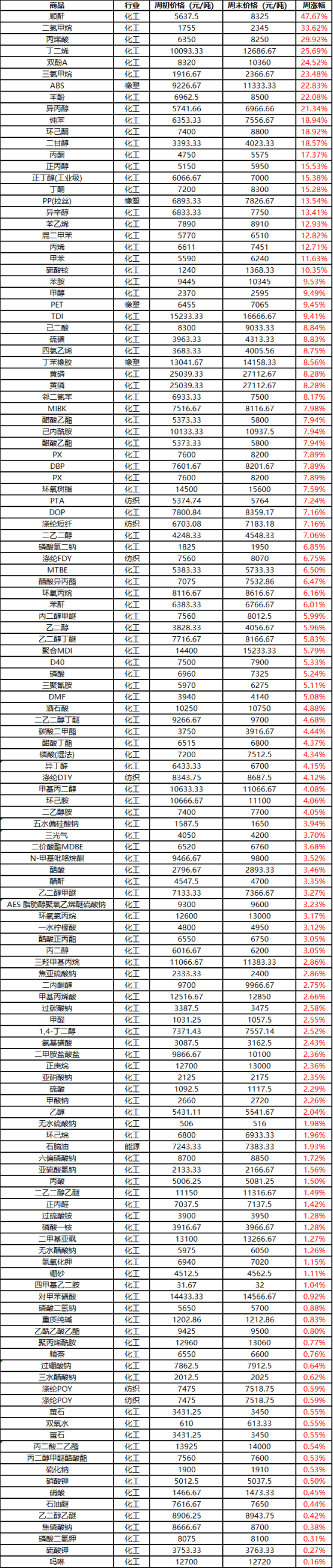 In the chemical market aspect,Affected by international geopolitical conflicts, the prices of almost all commodities have surged, with the weekly increases of dozens of commodities reaching double-digit growth. Among them, the weekly increase of maleic anhydride reached.47%, with dichloromethane up 33% week-over-week and acrylic acid up 29% week-over-week.