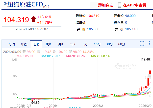 Affected by the situation in the Middle East, international oil prices continued to rise at the start of the new trading week on the evening of the 8th (U.S. Eastern Time), with the price of light sweet crude oil futures for April delivery on the New York Mercantile Exchange briefly approaching $120 per barrel, marking a gain of over 30%.