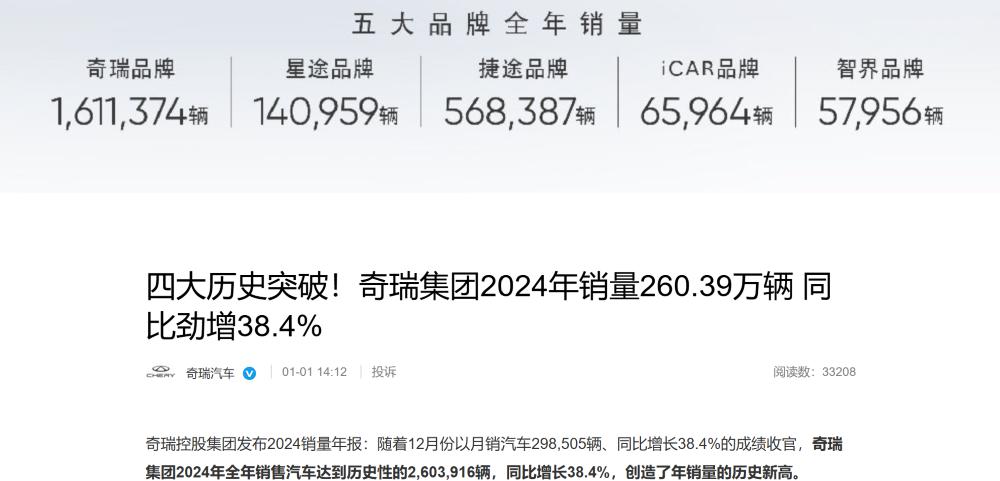 Sales-wise,In 2024, Chery Automobile's annual sales reached 2.6039 million units, a year-on-year increase of 38.4%, setting a new record. Among these, exports accounted for 1.1446 million units, a year-on-year increase of 21.4%, maintaining the position as the number one exporter of Chinese passenger car brands for 22 consecutive years.。
